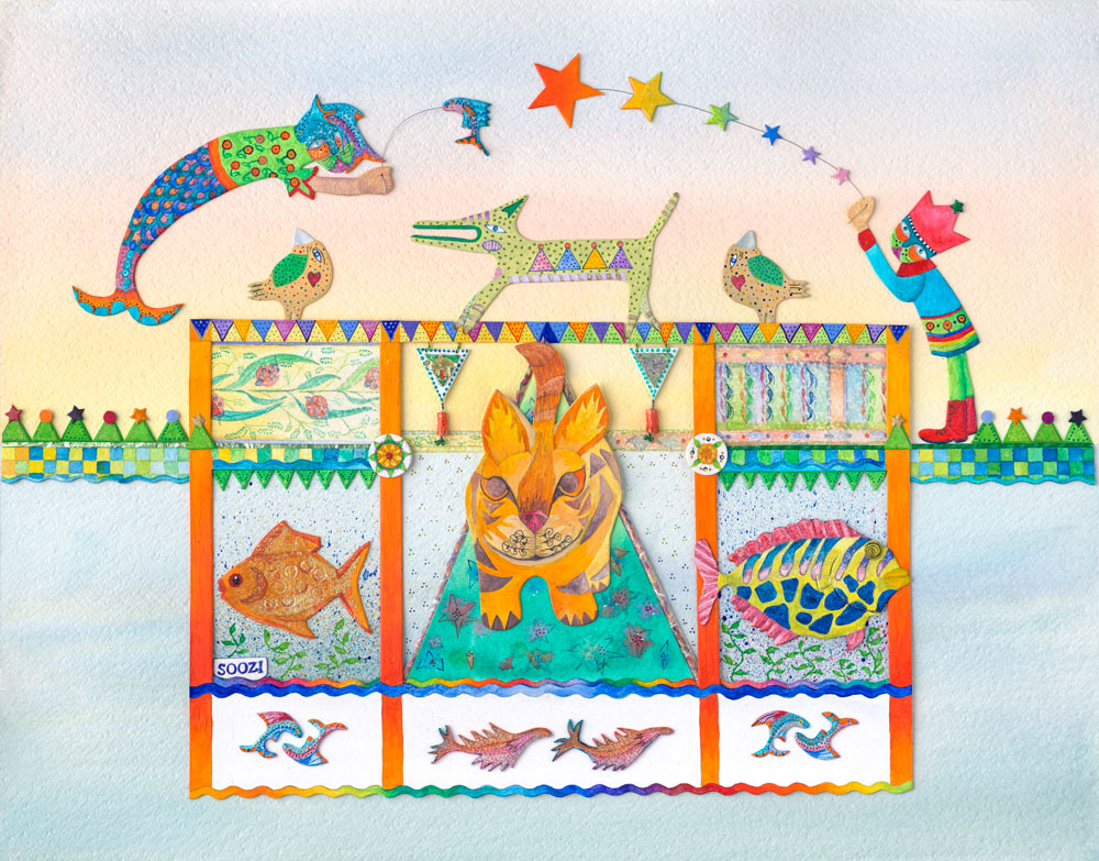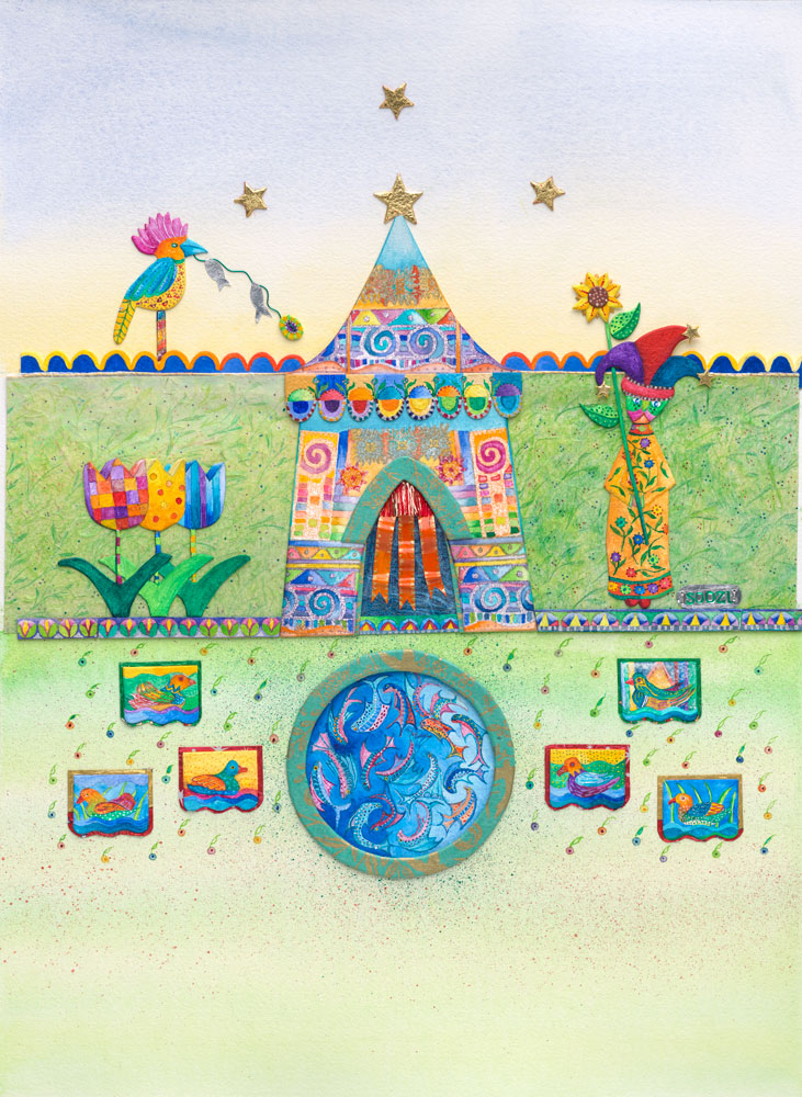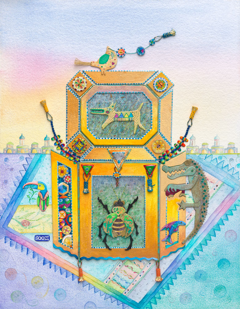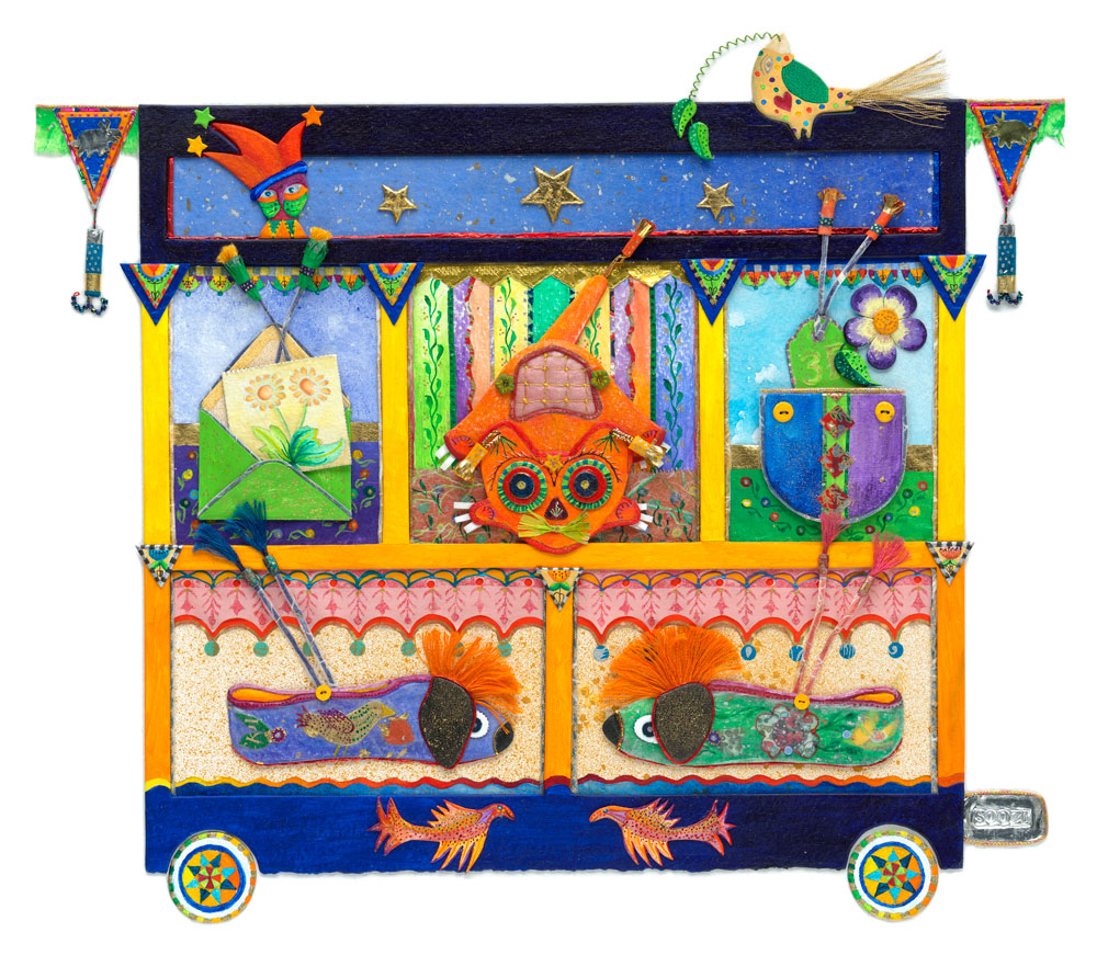 I’m an elusive out-of-the-box Jester, hiding in mix medium, paint, textiles, paper/card, wire and wood, esoteric fantasy objects from travel through the imagination out of my head, as well as from Morocco to Nepal, Panama, Venice and Africa.